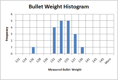 This sample was measured several times and errors in measurement are unlikely. The weight and length difference might be explained by loss of external patina (see field variation figure) and perhaps an internal casting bubble can account for the anomalies. The histogram of measured bullet length is clustered around 0.625 to 0.630. This does not correspond with the published values of 0.640 for T&T38 and T728.