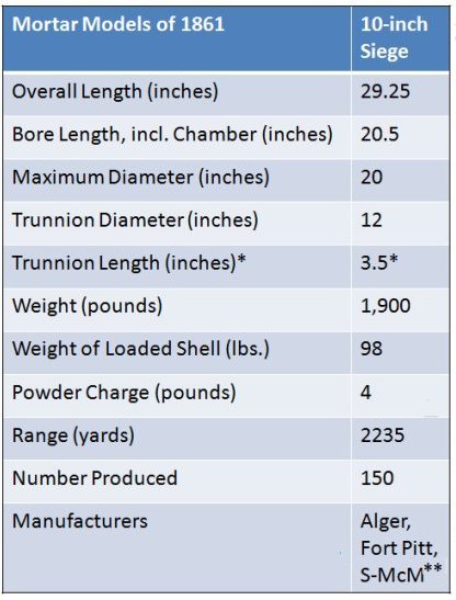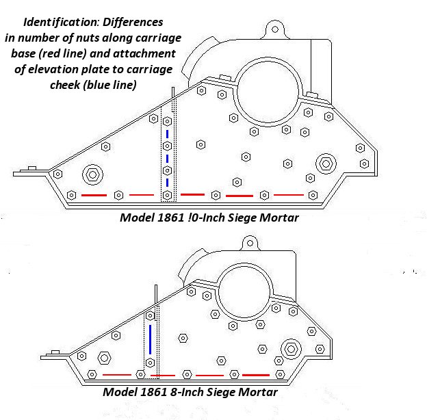 Siege mortars manufactured prior to the Model 1861 were a "hodge podge" of design, particularly in their carriages. The Model 1861 carriage and barrel were standardized.. The most obvious model difference is the large trunnion of the Model 1861 when compared to the 1841 Model.. Differences between the Model 1861 8-inch and 10-inch are shown below. The carriage difference allows for identification from old photographs and in person where distance is limited.