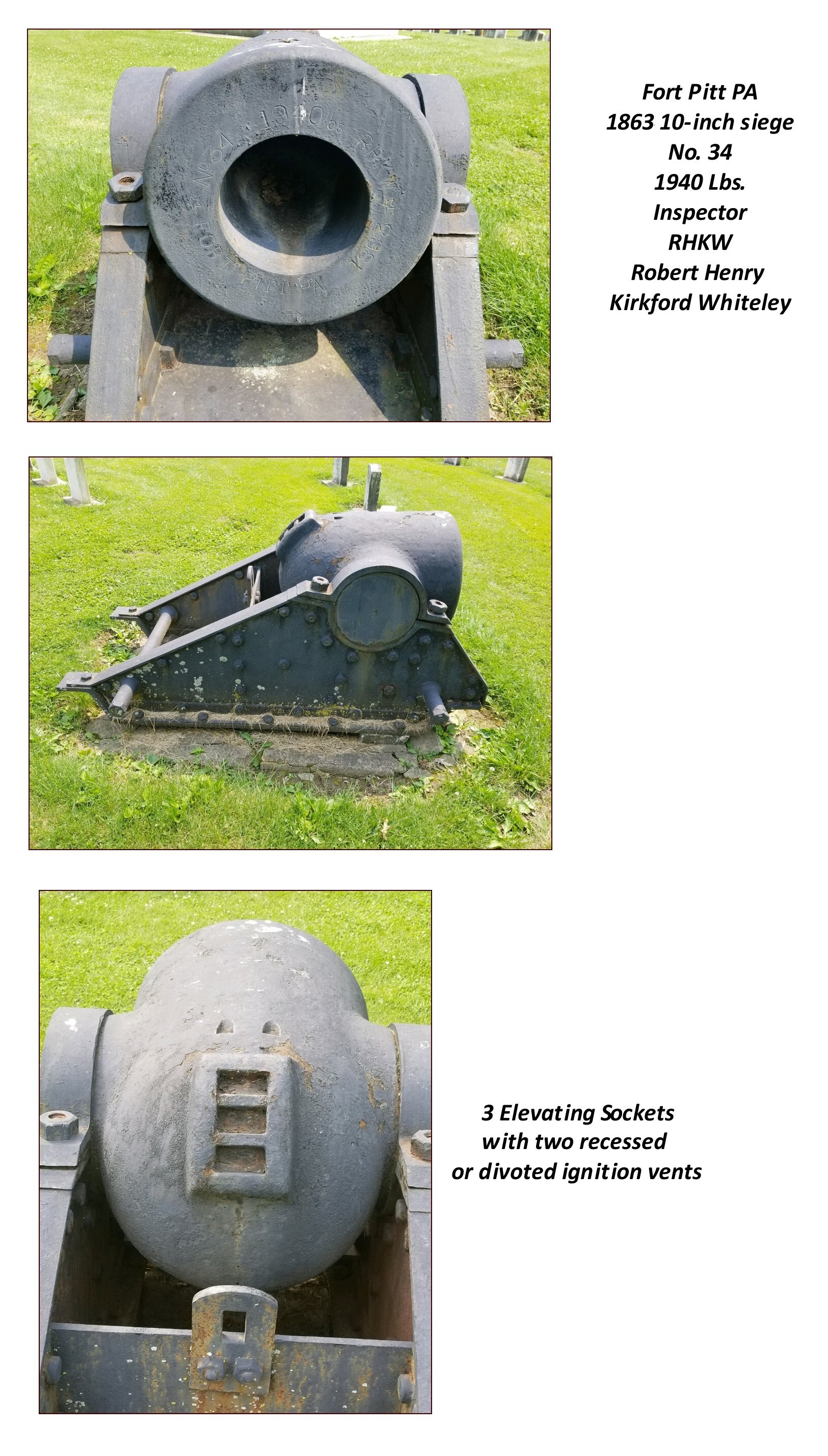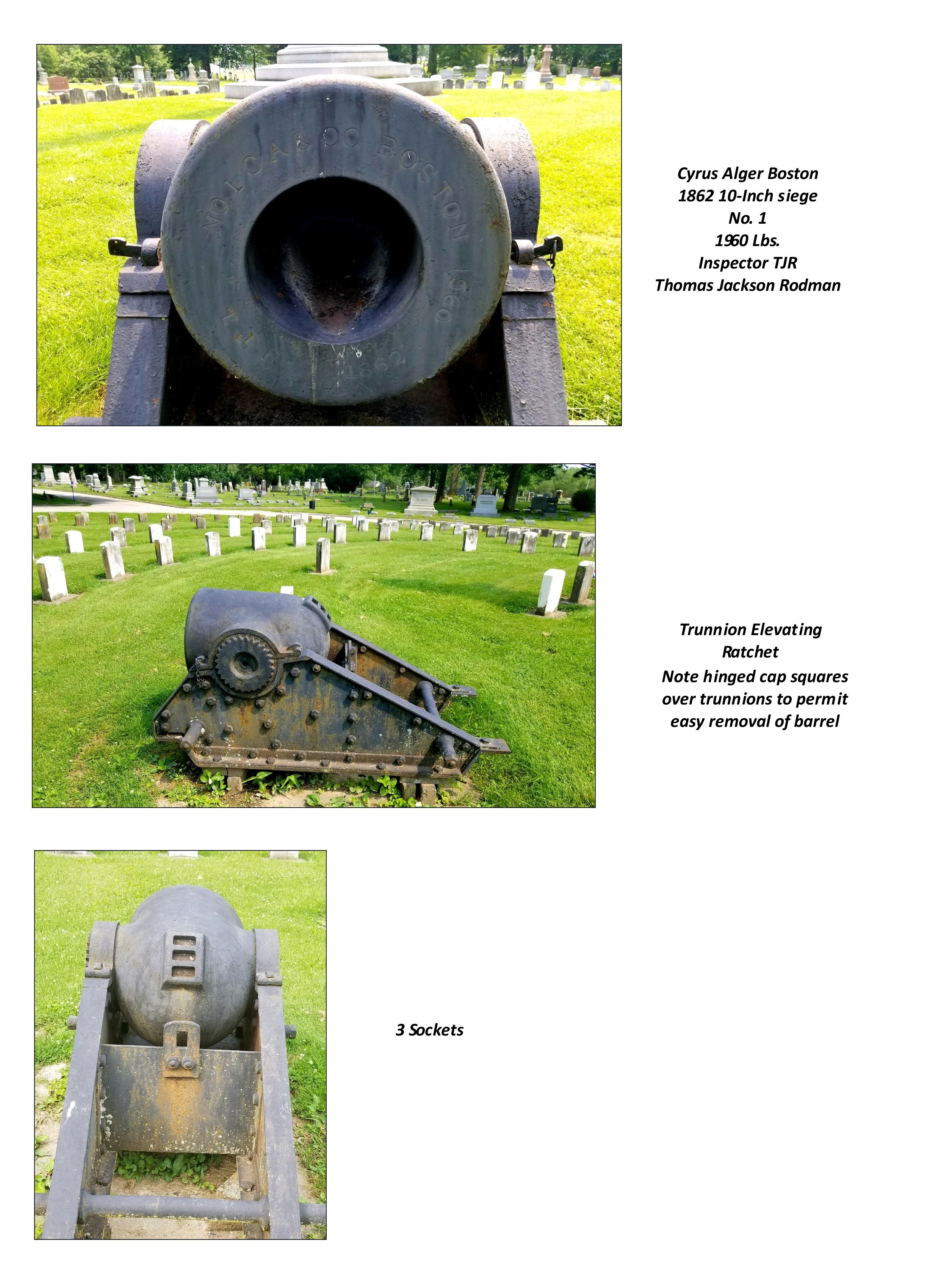 This location is one of the few places in the US where mortars of every foundry (Cyrus Alger of Boston, Fort Pitt of Pittsburg, and Scott Foundry of Seyfert, McManus of Reading) can be found together. All of the siege mortars at Soldier's Circle are Model 1861. At first view, they all appear to have an identical carriage but a closer inspection will show differences between the manufacturers.