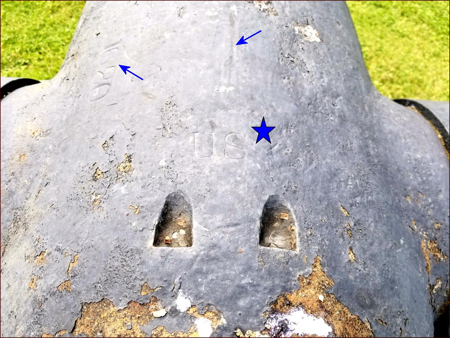 Fort Pitt No. 34 cast in 1863 with recessed vents. Note "US' inspection stamp (blue star) and foundry barrel number "1620" (blue arrow) and possible removal scar? of lifting ear or "line of metal" pointing mark (blue arrow)