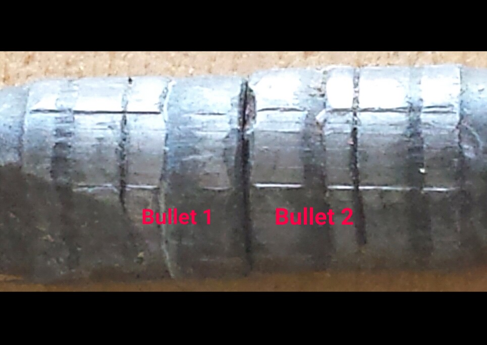 Field collected .22 Long Rifle Martin Micro-Groove bullet. Grooves are twice as wide as lands. UPDATE: The author recently was able to get extreme detail on the striations in the grooves portion of two Remington bullets laid side to side using a cell phone magnification application. The results are shown below.